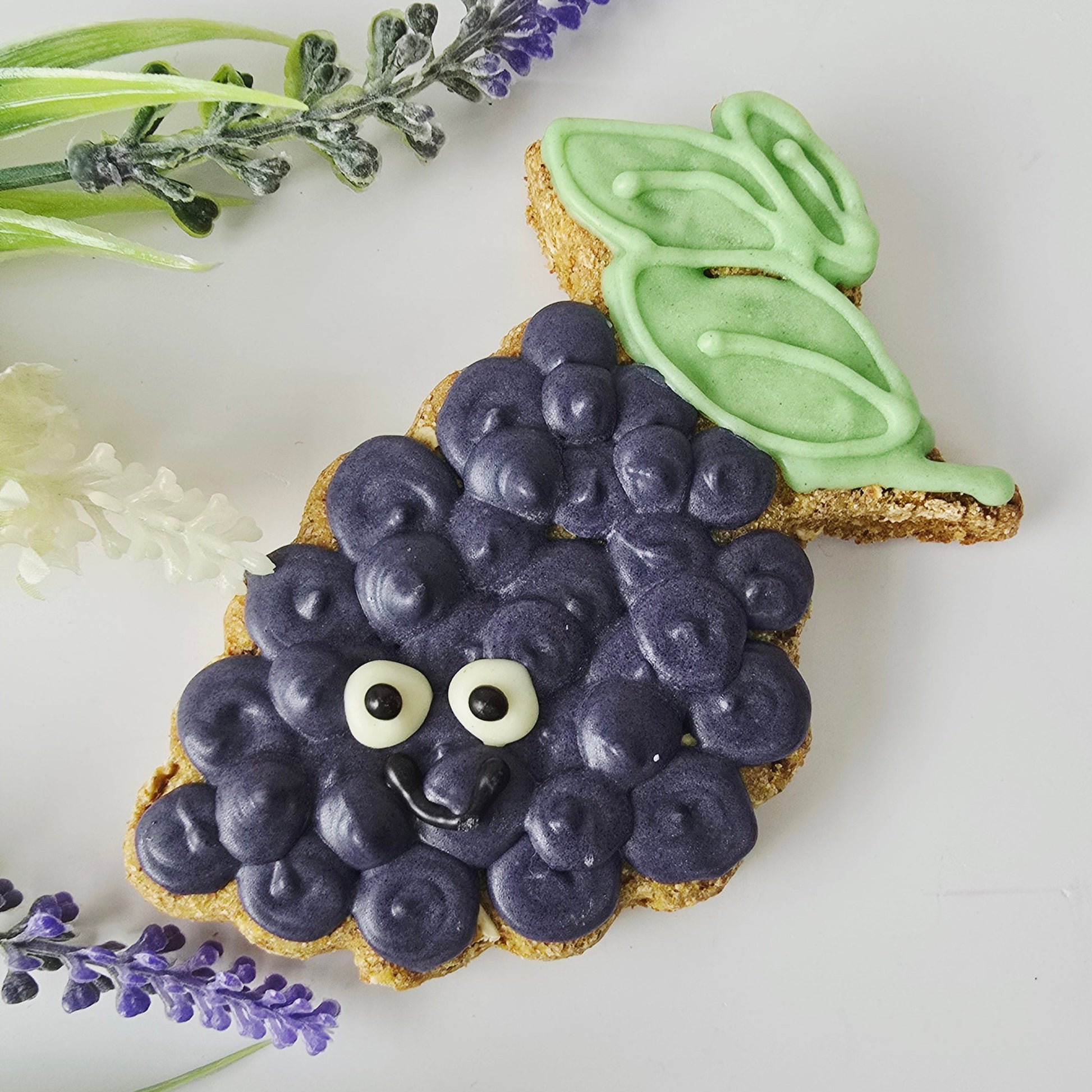 Iced Biscuit Composition:Wholemeal Organic Flour, Refined oats,Parsley, Turmeric, Kelp, coconut Oil , carob , maize flour,tapioca flour,yoghurt powder ,water, natural food coloring Analytical Constitutes (per 100g): Energy (Kj/Kcal): 1495/356, Fats & Oil: 15%, Fibre: 28%, Protein: 22%, Ash: 3.5%.