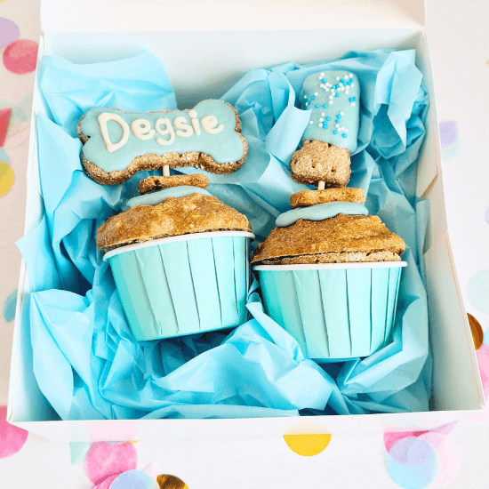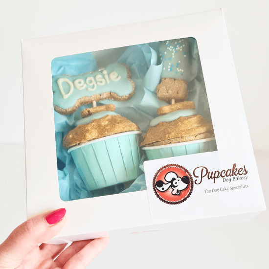 Make your dog's birthday special with this Pupcake Set. It includes all you need to make your dogs birthday pawsome - 2 dog cupcakes, featuring your dog's name, and their age. Personalise your pup's special day with this unique dog cake gift set.