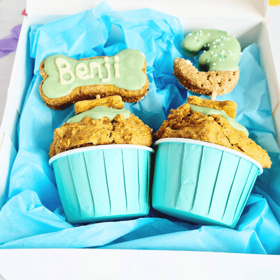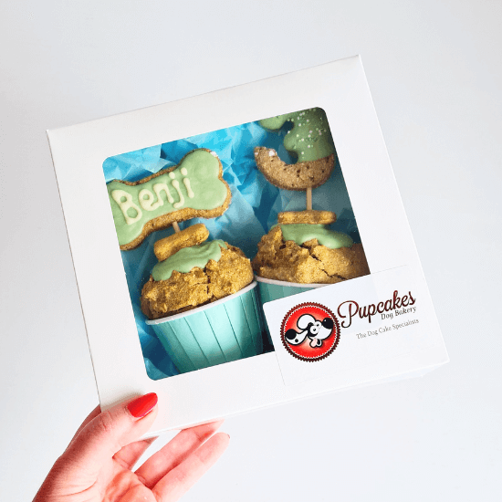 Topped with our doggie icing in green and a peanut butter dog treat.In colour matching cupcake cases and beautifully boxed making them the pawfect dog gift.
