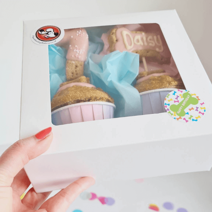 Topped with our dog icing in pink and a peanut butter dog treat.In colour matching cupcake cases and beautifully boxed making them the pawfect dog gift.