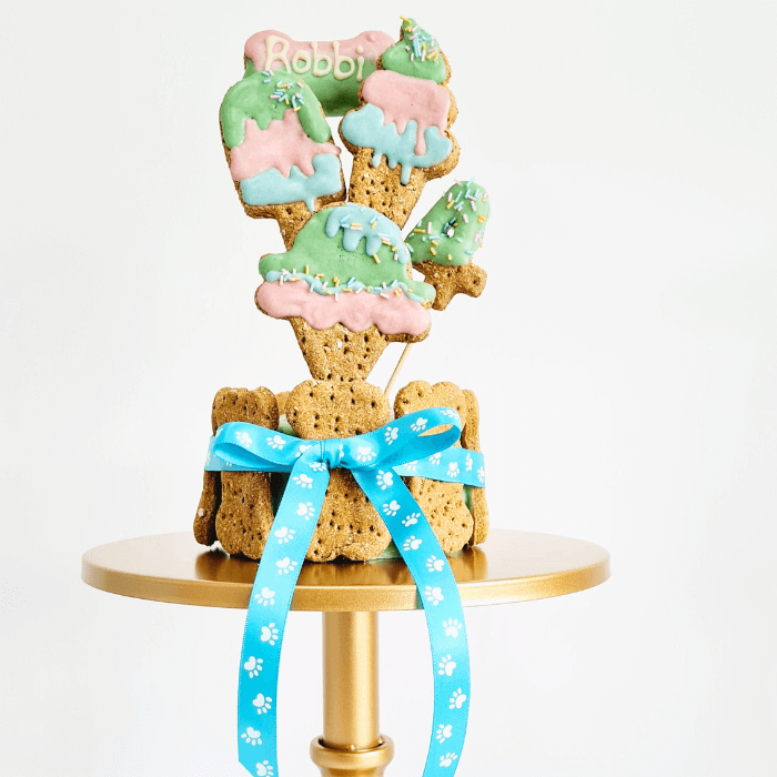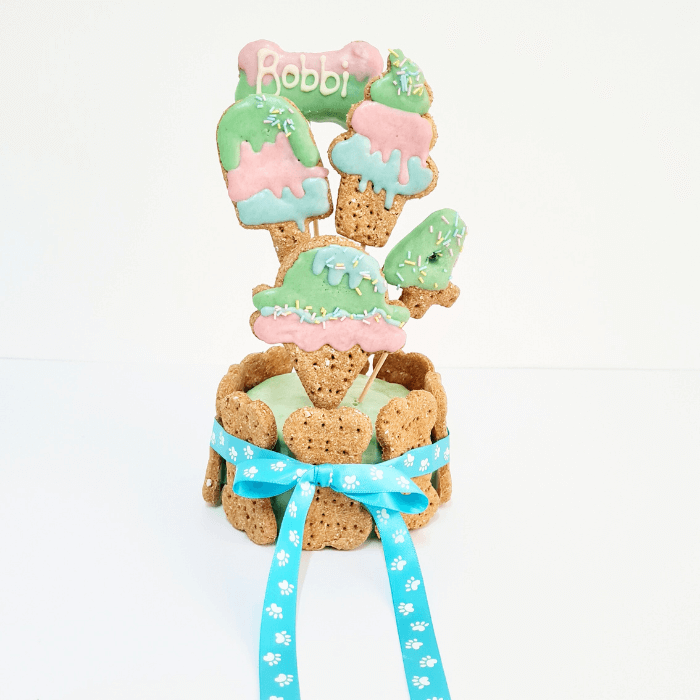 Celebrate your dogs's birthday with this custom-made Doggie Icecream Dog Cake. It features a treat-filled and ice cream themed cake. With its delicious taste, your dog will truly enjoy its special day. Every loaded Dog Cake is personalised with your dogs name & age, making it the perfect dog cake for the pawty.