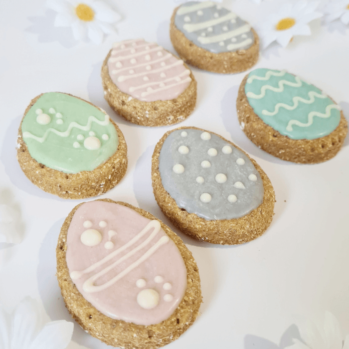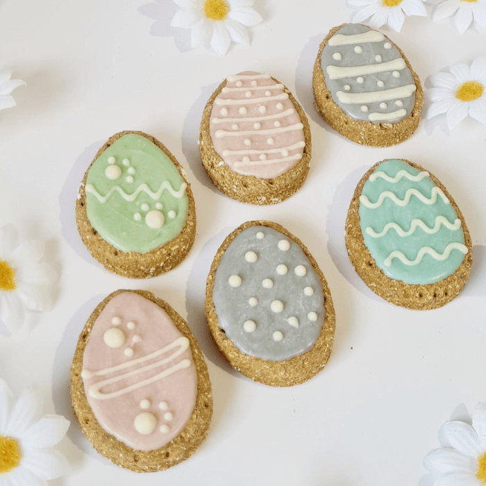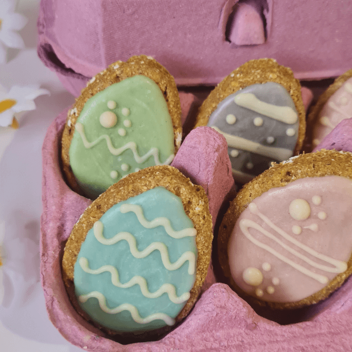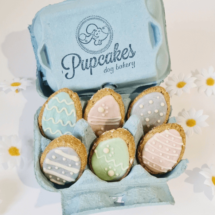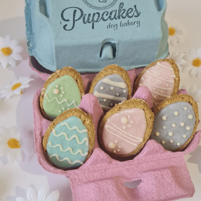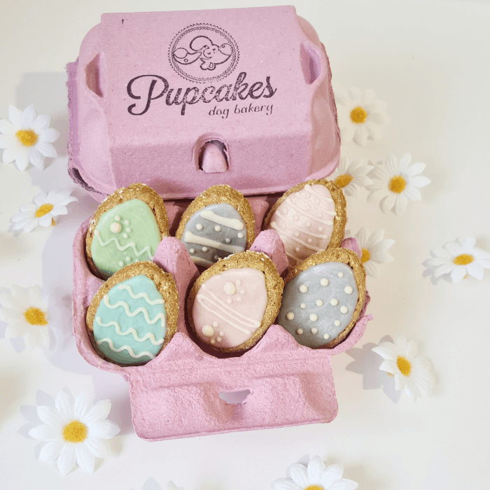 Indulge your furry friend with our Doggy Easter Egg Set. Each set includes 6 hand-baked Easter egg cookies, decorated with our unique dog-friendly chocolate formula. Each egg is hand decorated separately , may differ slightly to picPerfect for an Easter egg hunt or as a thoughtful gift for your pup.Presented in our eggtastic egg boxes , colors vary