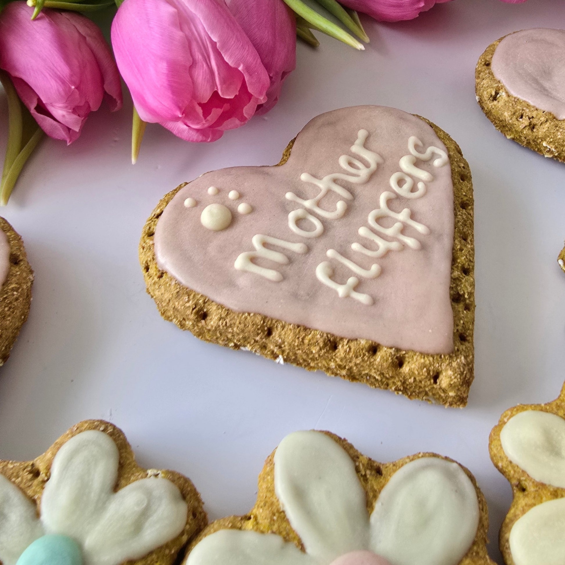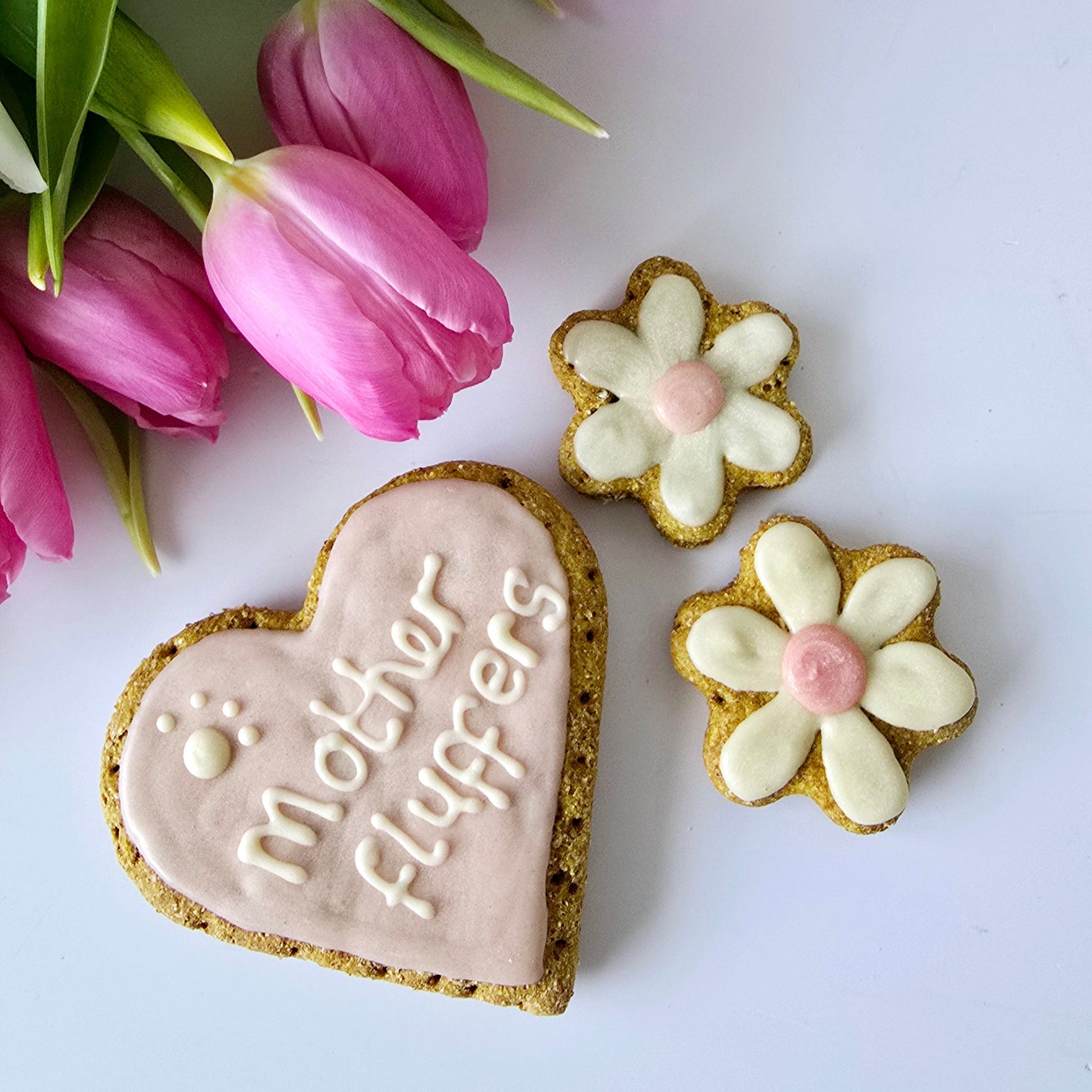 Celebrate your pup's favorite mom with our mother fluffers Dog Treat set! These adorable Pink treats, heart and flower shaped, are the perfect way to show your furry friend some love on Mother's Day. They'll be sure to make tails wag and hearts happy!