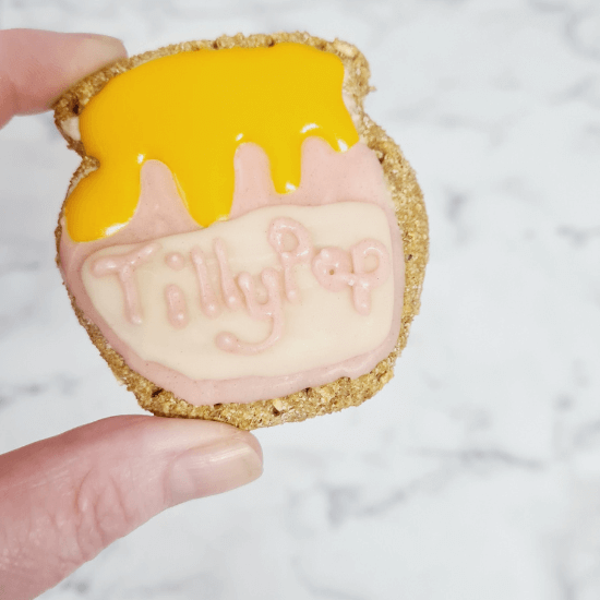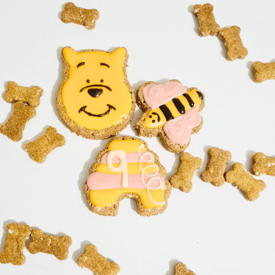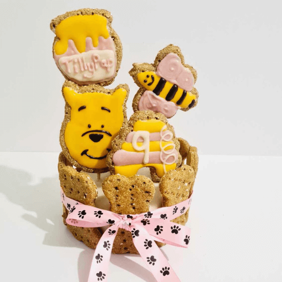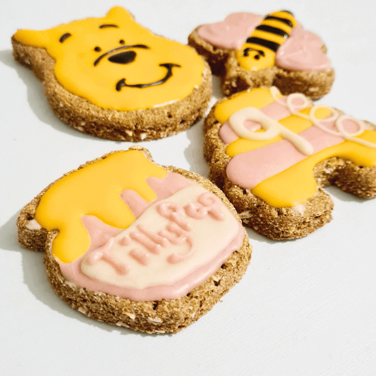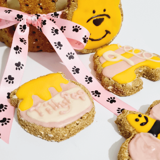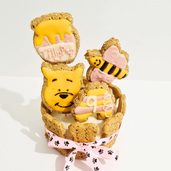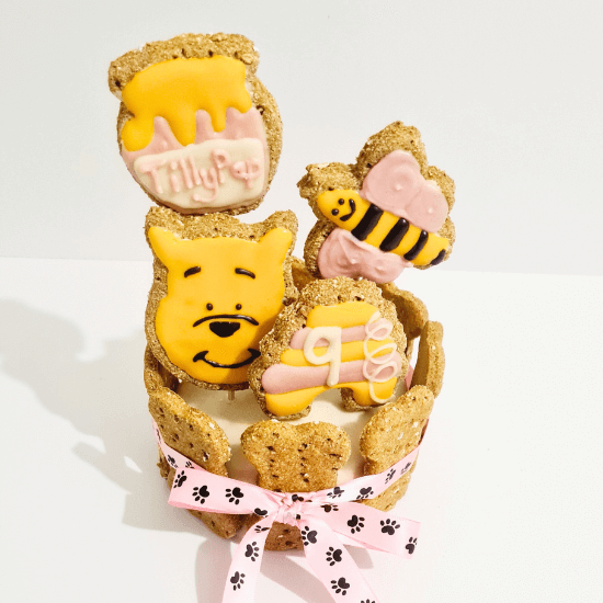 1 xWinnie the pooh cookie , 1xPersonalised honey bone (we will add a personalised bone if your dogs name does not fit ) 1 x Busy Bee cookie and 1 x Beehive cookie with dogs age on.