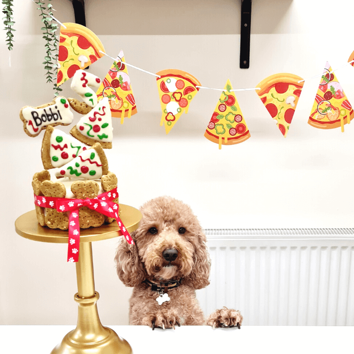 Our pizza dog cake is surrounded with our signature peanut butter dog treats, creamy hand made Carob topping& natural food colouring.